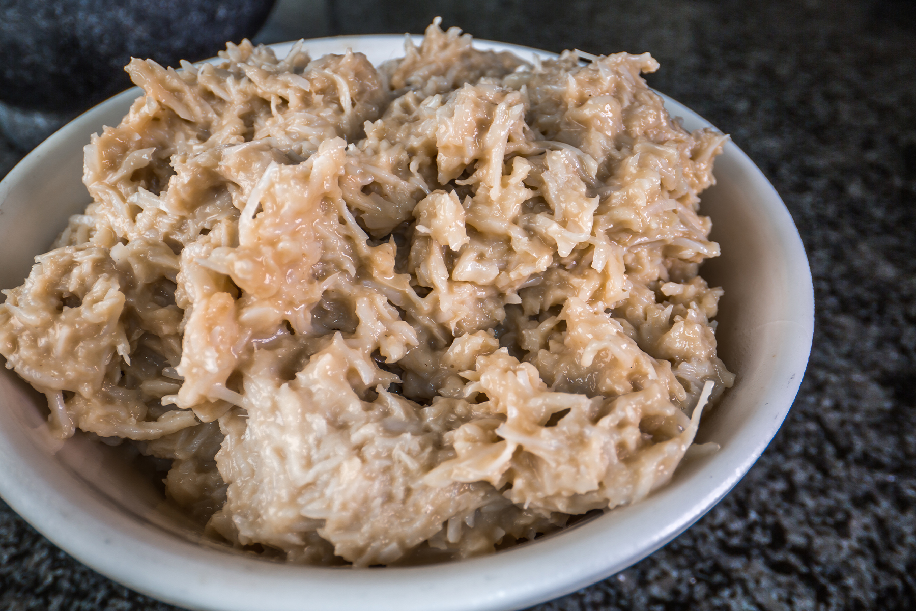This does break up the meat fibres slightly, and also slight remnants of brown meat on the purse gives the meat a light creamy colour.